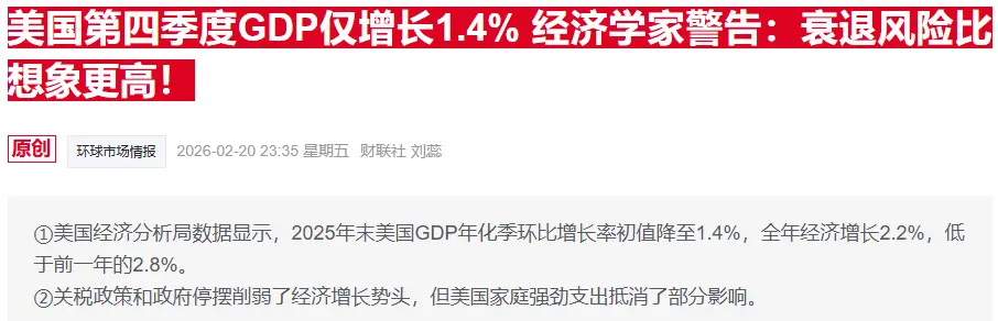 盘前,美国商务部公布的初步数据显示,美国2025年第四季度经济增速为1.4%,显著低于市场预期的2.8%;全年增速为2.2%,为2021年以来的最低水平。