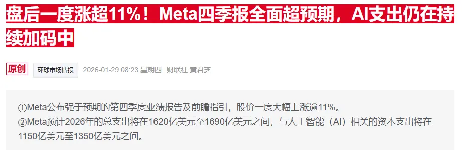 上月,Meta在业绩报告中预计,2026年资本支出将达1150亿美元至1350亿美元,超过分析师平均预期的1106亿美元。这一数字几乎是其2025年资本支出(722亿美元)的两倍。