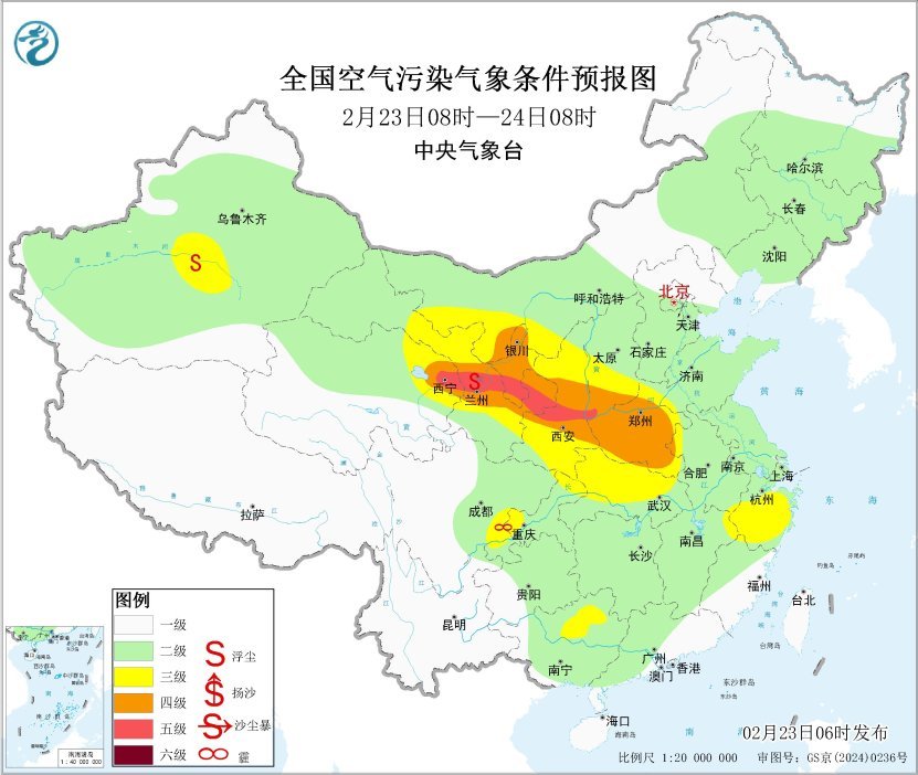 23日,受上游传输影响,区域大部有扬沙或浮尘天气。24日起,区域大气扩散条件一般,其中陕西关中地区有轻度霾。