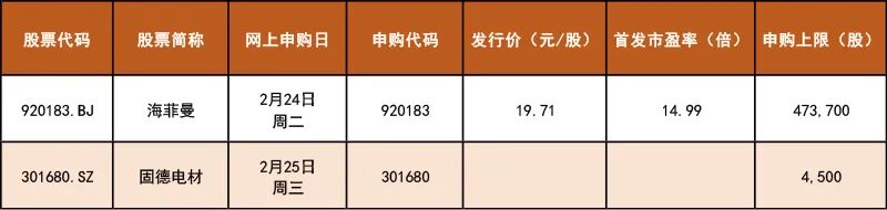 据目前安排,若无变化,本周(2月23日至27日)有2只新股可申购,包括创业板1只和北交所1只。