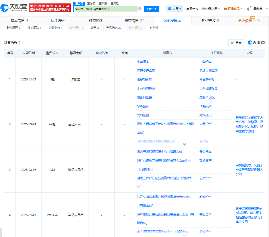 天眼查显示,智平方当前完成5轮融资,其中2025年1月、3月、9月相继完成Pre-A轮、A轮、A+轮融资,并且每一轮的融资金额均为数亿元级。