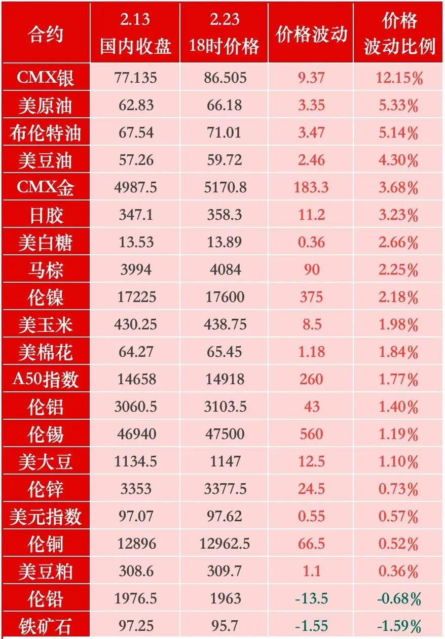 对于春节假期外盘表现,格林大华期货首席专家王骏概括为“普涨、分化、波动加剧”三大特征。他认为,大部分商品价格上涨行情是受美伊冲突等宏观因素驱动,能源板块整体上涨显著,贵金属板块也受此影响录得明显上涨。