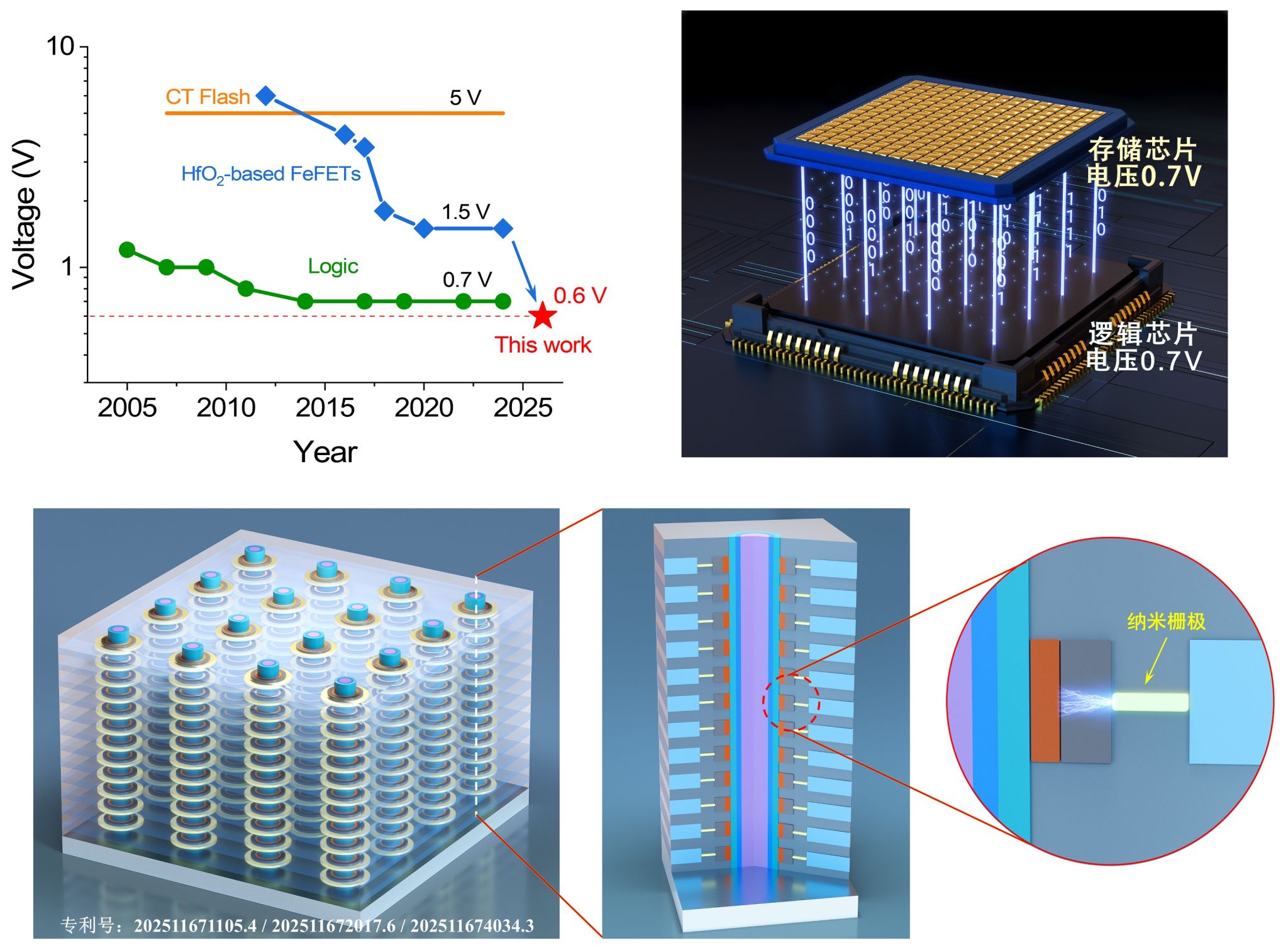 铁电晶体管利用铁电材料的极化翻转实现数据存储,是后摩尔芯片技术中极具潜力的半导体存储器,受到学术界和业界广泛关注。凭借极化双稳态存储机制和三端晶体管结构,有望构建非易失性存算一体架构,实现存储与高速计算的完美结合,是破解“存储墙”和实现人工智能底层架构革新的关键新技术。然而迄今为止,受限于平板铁电体矫顽电压的物理限制,传统铁电晶体管仍需用1.5V以上电压实现铁电极化翻转和数据擦写。尽管优于Flash,但常规铁电晶体管理论上无法降低电压到0.7V以下,即无法匹配到逻辑电压水平。如何实现亚0.7V的超低电压存储技术,是突破存储墙瓶颈和提升AI芯片算力的关键。