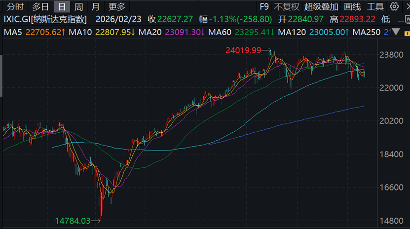 北京时间2月24日凌晨,美国三大股指全线收跌,道指跌1.66%报48804.06点,标普500指数跌1.04%报6837.75点,纳指跌1.13%报22627.27点。热门股方面,IBM跌超13%,美国运通跌逾7%,领跌道指。IBM创2000年以来最大跌幅,因核心业务面临AI威胁。万得美国科技七巨头指数跌0.99%,微软跌超3%,特斯拉跌近3%。