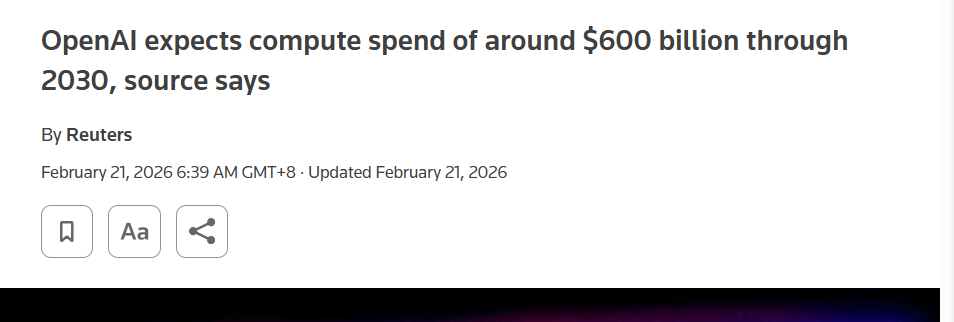 2月23日消息,据路透社报道,一位知情人士透露,OpenAI 的目标是到 2030 年实现约 6000 亿美元的计算总支出。