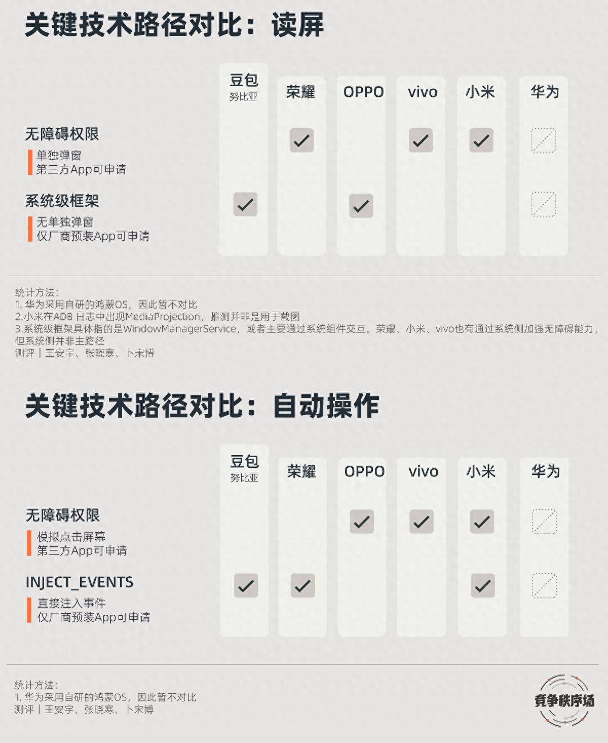 在自动操作层面,权限升级同样明显。OPPO和vivo的技术主路径为利用无障碍权限模拟点击,豆包和荣耀申请了inject_events权限,小米两者都有涉及。