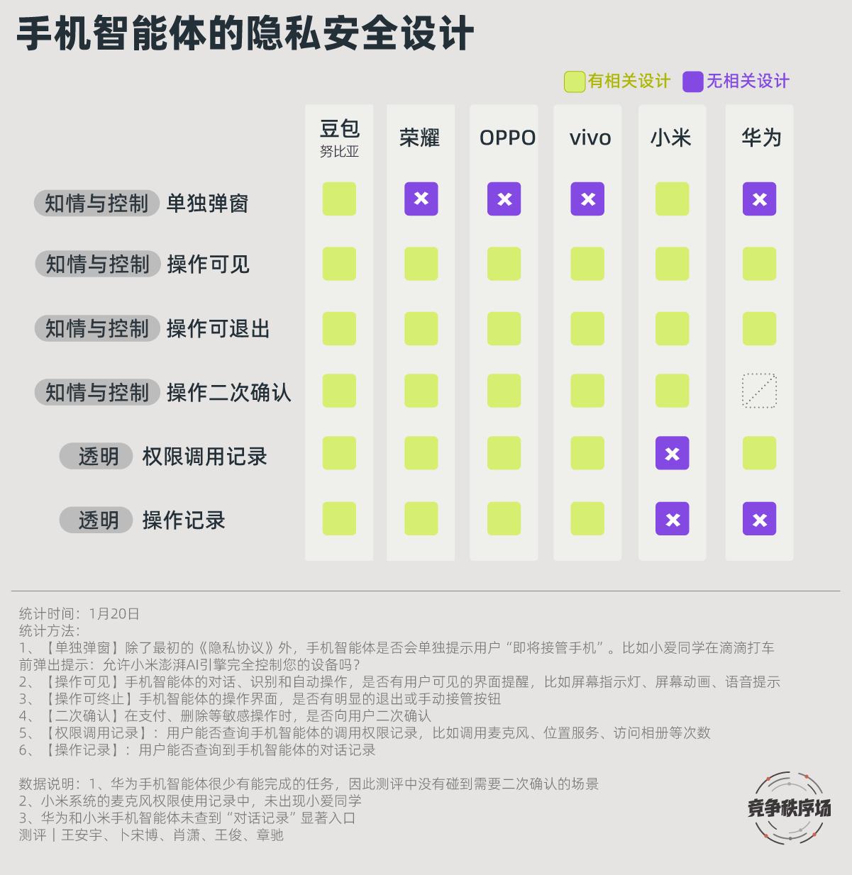 我们联合复旦大学张晓寒、云安全联盟王安宇和卜宋博,新一轮测评了豆包手机助手、智谱、荣耀、华为、小米、OPPO、vivo七款手机智能体,追踪它们的底层模型、系统权限、隐私设计最新情况。