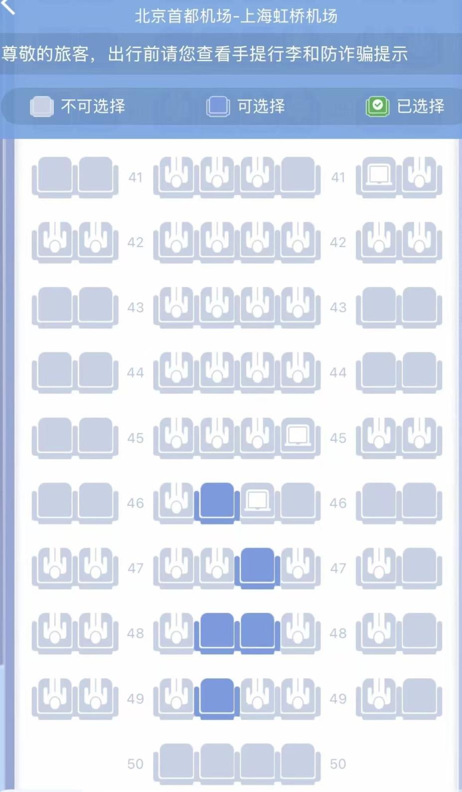 赵先生提供的座位图,31排至50排只有这5个中间座位可选。