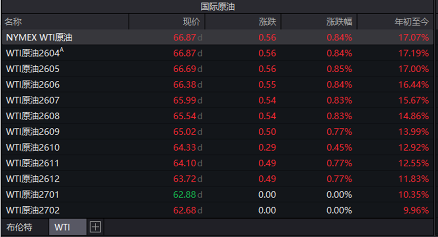 受上述因素影响,国际原油期货市场在节日期间呈现震荡上行态势。截至2月24日,据wind统计数据,WTI原油盘中报66.87美元/桶,年初至今在上涨17.07%;ICE布油盘中报71.61美元/桶,年初至今累计上涨19.27%。两大基准油价的强势表现,反映出市场对供应端风险的重新定价。