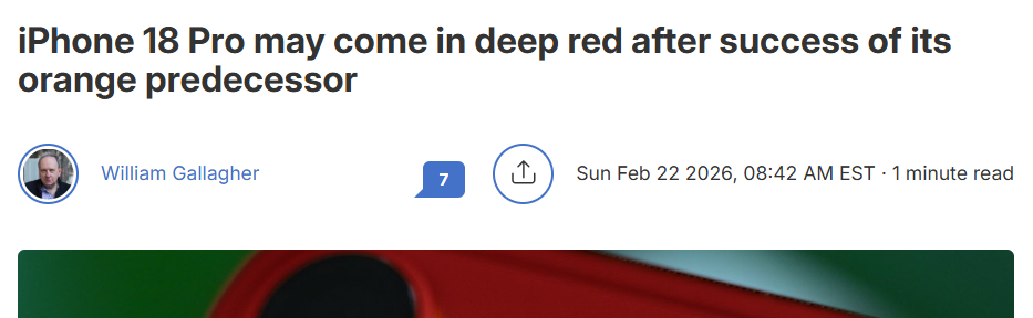 2月24日消息,据AppleInsider援引彭博社报道称,苹果公司正在为iPhone 18 系列两款Pro机型测试全新的红色配色。