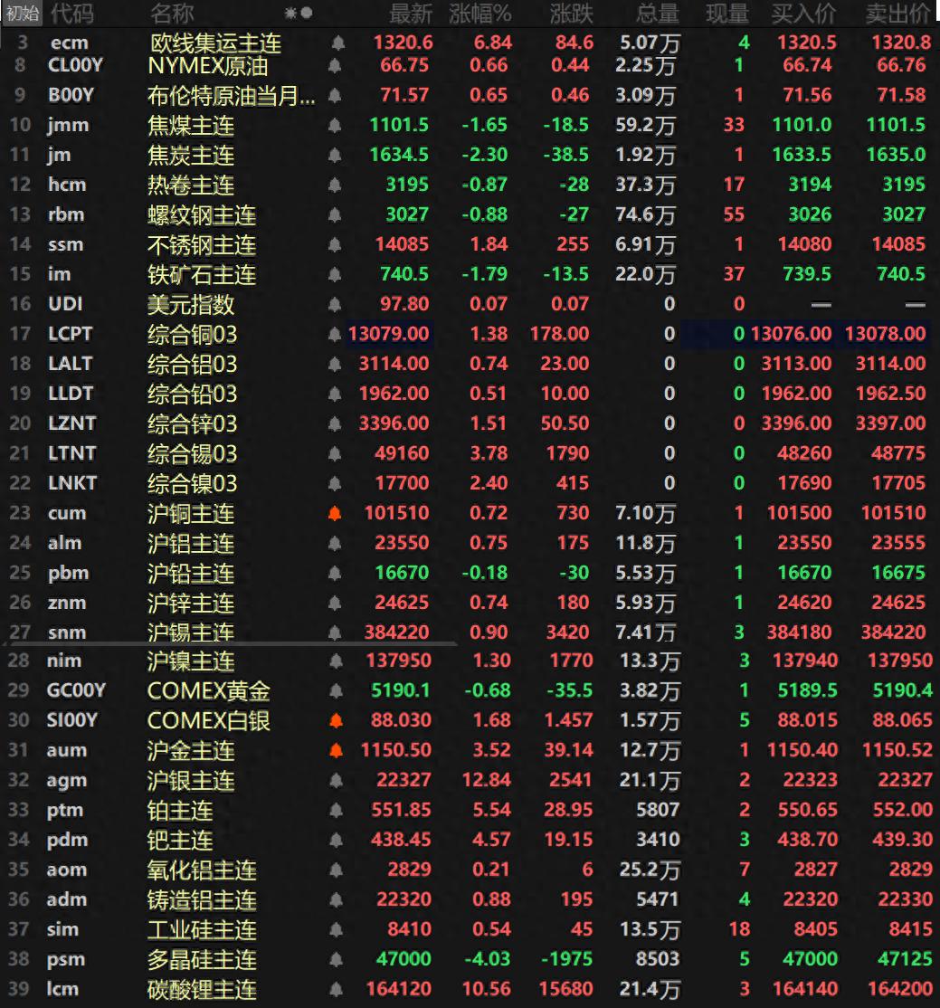 外盘方面,截至15:04分,外盘基本金属集体飘红,且涨幅相较内盘更胜一筹,伦锡以3.78%的涨幅领涨,伦镍涨2.4%,伦铜涨1.38%,伦锌涨1.51%,其余金属涨幅均在1%以内。