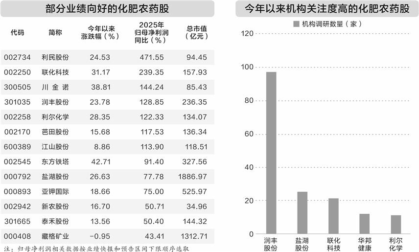 今年以来,业绩较好的化肥农药股获得机构关注。统计显示,5只业绩预增或扭亏的概念股年初以来接受10家及以上机构调研,润丰股份、盐湖股份、联化科技获机构调研家数较多,分别为97家、25家、21家。