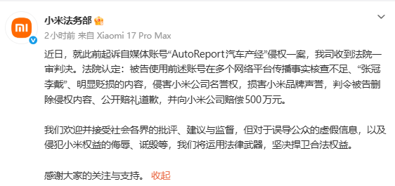 近日,就此前起诉自媒体账号“AutoReport汽车产经”侵权一案,我司收到法院一审判决。法院认定:被告使用前述账号在多个网络平台传播事实核查不足、“张冠李戴”、明显贬损的内容,侵害小米公司名誉权,损害小米品牌声誉,判令被告删除侵权内容、公开赔礼道歉,并向小米公司赔偿500万元。