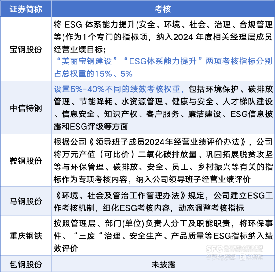 在考核机制方面,除包钢股份外,其余5家钢企均表示已经将ESG指标纳入高管薪酬考核。其中,宝钢股份更是披露了详细的指标数,明确将“美丽宝钢建设”“ESG体系能力提升”两项考核指标分别占总权重的15%、5%。