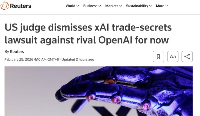 2月25日消息,据路透社报道,美国加州旧金山联邦地区法官丽塔·林(Rita Lin)于当地时间周二正式驳回埃隆·马斯克旗下人工智能公司xAI对OpenAI及其首席执行官萨姆·奥特曼(Sam Altman)的商业机密窃取诉讼,裁定现有指控未能证明OpenAI存在不当行为。