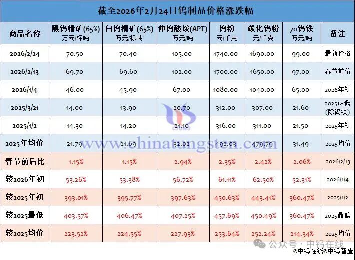同日,章源钨业(002378.SZ)官微发布2026年2月下半月长单采购报价(13%增值税),相关产品价格有所上调。