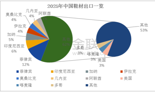 从下游制品出口角度测算,若在原有税负基础上,再叠加额外临时关税,EVA鞋材、包装膜等轻工制品的出口成本将出现明显抬升,企业利润空间被大幅挤压。当前中国鞋类出口企业整体毛利集中在5%-15%区间,新增关税足以覆盖大部分企业的正常盈利空间,叠加中小企业议价能力偏弱、难以将成本有效传导至海外客户,中小鞋材及制品企业将面临订单萎缩、盈利承压甚至亏损的风险。海关数据显示,如上图,2025年中国鞋材出口至美国市场,占中国鞋材总出口份额约3.25%。当前全球鞋类供应格局已发生转变,越南已取代中国成为美国第一大鞋类供应国,此次关税加码将进一步削弱中国制品的价格竞争力,加速海外订单向越南、柬埔寨等东南亚低成本地区转移。