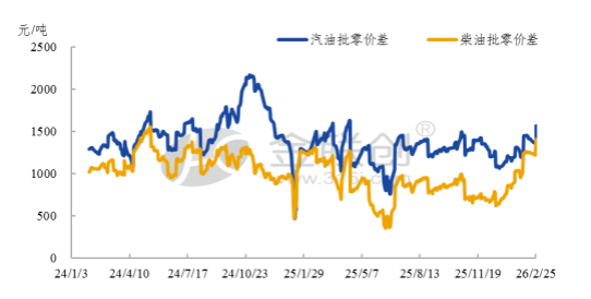 2026年以来国际市场方面在地缘风险升温、供应端收紧、需求端韧性增长三大核心因素共同作用之下,原油价格走势呈现“整体上行、小幅回调”的运行特征,布伦特站稳70美元/桶附近,WTI原在66美元/桶附近波动,春节假期期间累计涨幅近6%。受此影响,国内成品油零售价调整节后首日迎来上调,但节后原油收盘连续两日下跌,消息面支撑不足,批发端行情趋弱运行为主,国内批零价差走势再创新高。其中汽油批零价差触及2025年4月以来的高位,柴油批零价差触及2024年5月以来的高位。