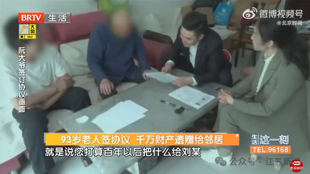 2023年3月,在律师见证下,阮大爷再次签订遗赠扶养协议,约定由刘某负责老人的生养死葬,同时老人将包括五套安置房在内的全部财产赠与刘某。