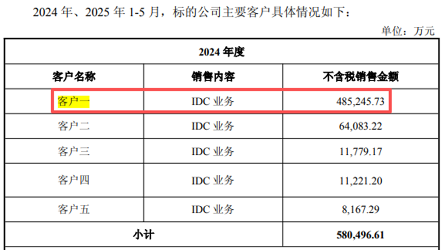 2024年以及2025年1-5月,秦淮数据中国的第一大客户均为“客户一”,相关不含税销售金额分别为48.52亿元和21.78亿元,占比约为80.23%和83.54%。