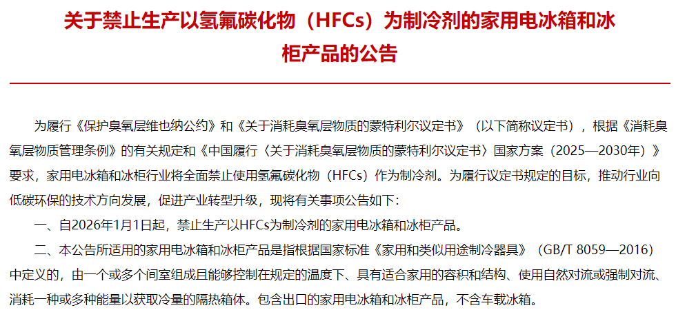 2025年11月,生态环境部发布关于禁止生产以氢氟碳化物(HFCs)为制冷剂的家用电冰箱和冰柜产品的公告。