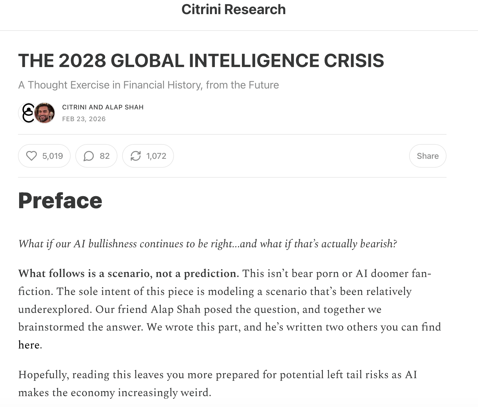 目前,Citrini Research这篇报告仅仅在X上的官方账号上阅读量就超过了2000万。报告的作者之一Alap Shah认为,市场反应“比我们此前预期的要大得多”。