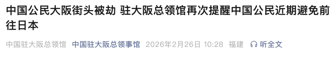 近期日本治安不靖,类似案件频发。驻大阪总领馆再次提醒中国公民近期避免前往日本,提醒领区中国公民密切关注当地治安形势,务必提高安全意识,避免携带大量现金出行,切实加强风险防范和自我保护。如遇紧急情况,请及时报警并联系驻大阪总领馆寻求协助。