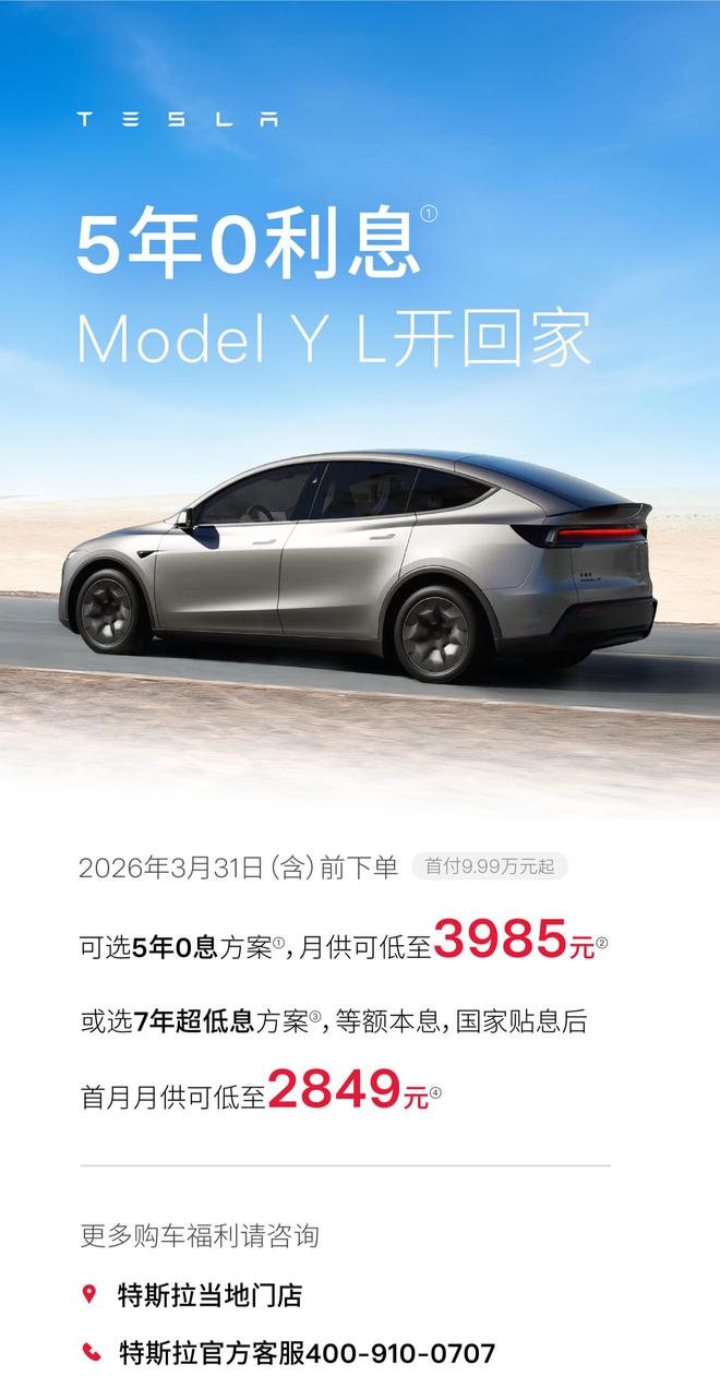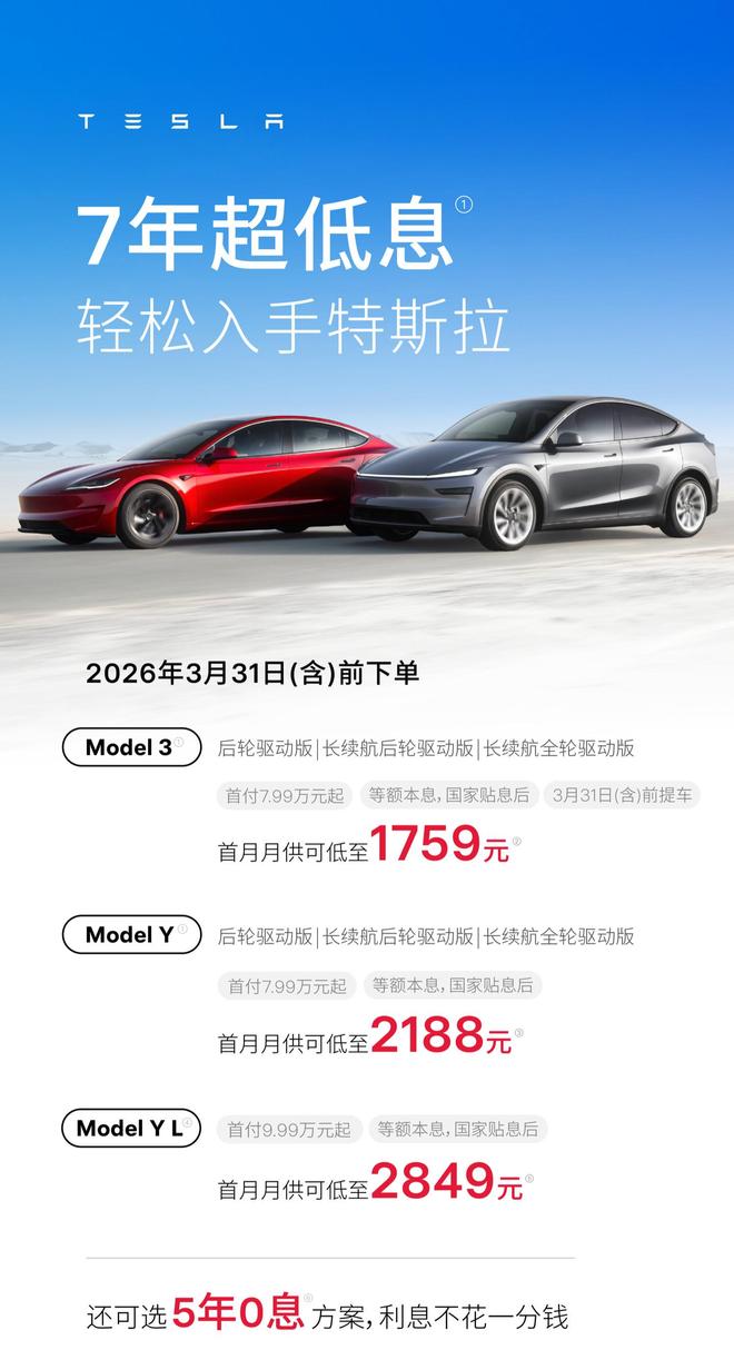 2月26日消息,特斯拉中国今日宣布,3 月 31 日(含)前下单,可享受 7 年超低息贷款购车政策。其中,Model 3 首付 7.99 万元起,首月月供可低至 1759 元;Model Y 首付 7.99 万元起,首月月供可低至 2188 元;Model Y L 首付 9.99 万元起,首月月供可低至 2849 元。上述三款车型同时提供 5 年 0 息贷款方案供消费者选择。
