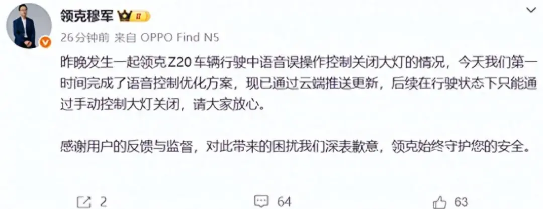 26日,领克汽车销售有限公司副总经理穆军在其个人微博上公开回应称,“昨晚发生一起领克Z20车辆行驶中语音误操作控制关闭大灯的情况,今天我们第一时间完成了语音控制优化方案,现已通过云端推送更新,后续在行驶状态下只能通过手动控制大灯关闭,请大家放心。感谢用户的反馈与监督,对此带来的困扰我们深表歉意,领克始终守护您的安全”。