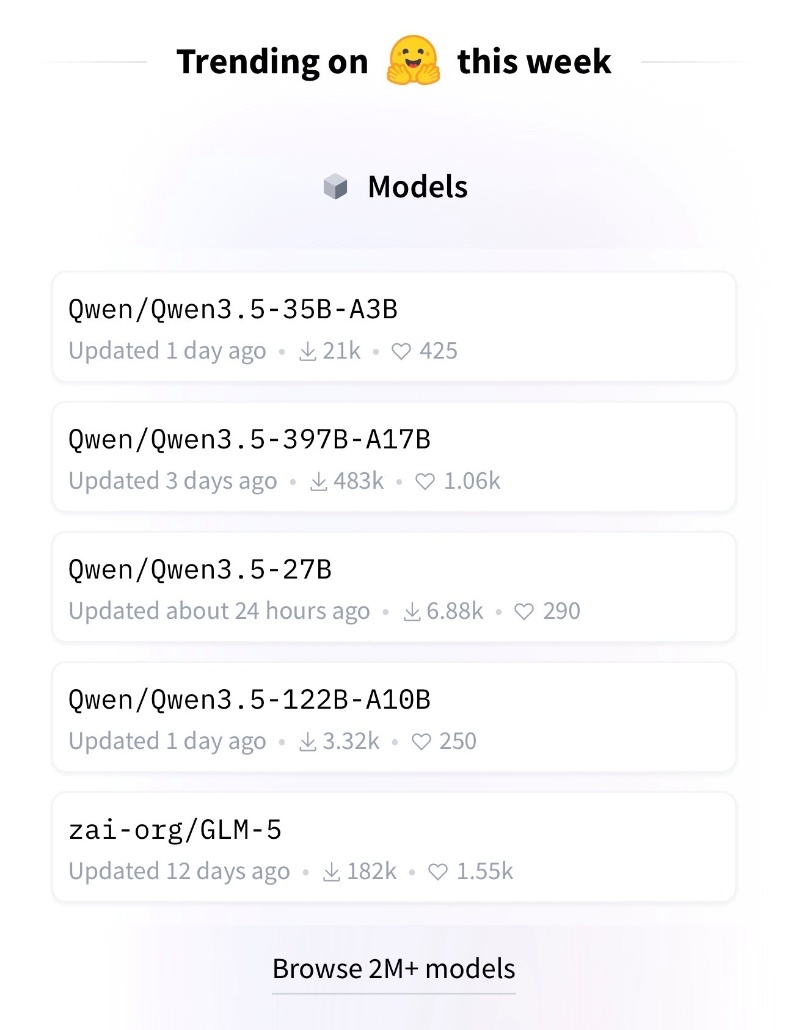 2月26日,全球最大 AI 开源社区Hugging Face公布新一期开源大模型榜单,阿里千问3.5模型包揽前四,成为全球AI社区最热门的开源模型。据了解,新上榜的三款中型千问3.5模型,在多个榜单表现均明显优于GPT-5 mini,且原生多模态能力和Agent能力强悍,性能刷新中等尺寸模型的新高,部分模型甚至可直接部署在消费级显卡上,开源不到24小时便实现登顶。在最新一期全球开源模型榜单中,排名前十的均是中国模型或中国模型的衍生模型,基于千问大模型的3款衍生模型同样入选前十。