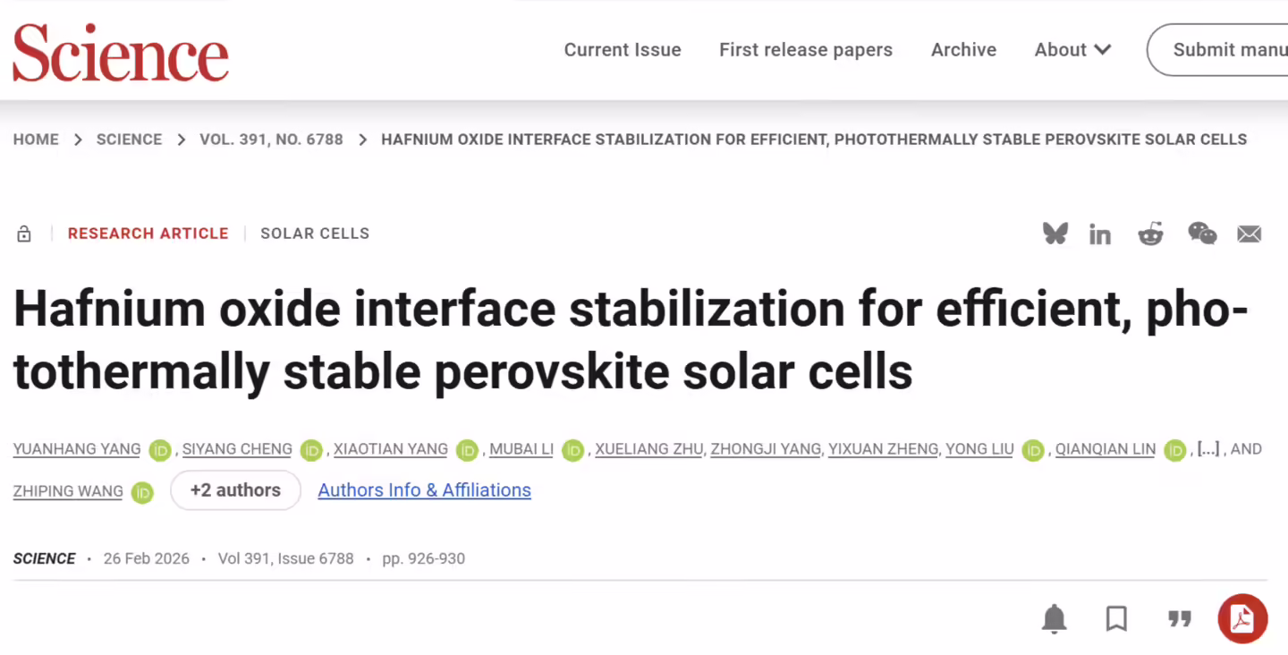 论文题为“Hafnium oxide interface stabilization for efficient, photothermally stable perovskite solar cells”(《氧化铪界面稳定策略实现高效、光热稳定的钙钛矿太阳能电池》)。武汉大学物理科学与技术学院博士后杨远航、博士研究生程思阳为共同第一作者,王植平为通讯作者,武汉大学为第一署名单位。