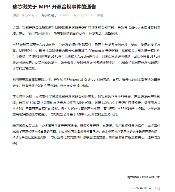 2月27日,瑞芯微发布关于 MPP 开源合规事件的通告称,近期,公司开源媒体框架软件MPP因部分代码开源许可证条款合规问题,导致其 GitHub 仓库被暂时冻结。在此,向开源社区、所有受影响的合作伙伴、开发者致歉。瑞芯微还表示,公司在事发后启动整改工作,并积极与FFmpeg 及 GitHub 组织沟通。目前,相关代码已全部替换为自主研发、符合开源协议的全新代码,并已提交至 GitHub。