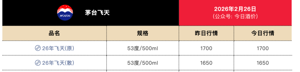具体来看,26年飞天茅台原箱(53度/500ml)报1700元/瓶,26年飞天茅台散瓶报1650元/瓶,均与此前两天持平。