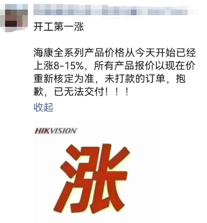 2月27日,财闻获悉,有安防产品销售人士称,海康威视全系产品价格今起上涨8-15%,并表示“所有产品报价以现在价重新核定为准,未打款的订单已无法交付。”