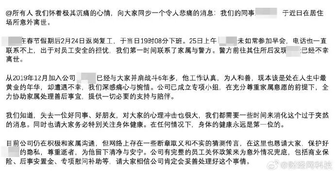 公司已成立专项小组,在充分尊重家属意愿的前提下,全力协助家属处理善后事宜,提供一切必要的支持与陪伴。我们知道,失去一位好同事、好朋友,对大家的心理冲击也很大,我们都需要一些时间来消化这个过于突然的消息。同时也请大家务必特别关注身体健康。在任何情况下,身体的健康永远是第一位的。目前公司仍在积极和家属沟通,但网络上存在一些断章取义和不实的猜测传言,在这里也恳请大家,保护好的隐私,尊重逝者,为他留下清净与安宁。公司有完整的员工关怀政策来为意外情况兜底,包括商业保险、后事安置金、专项慰问补助等,请大家相信公司肯定会妥善处理好这个事情。
