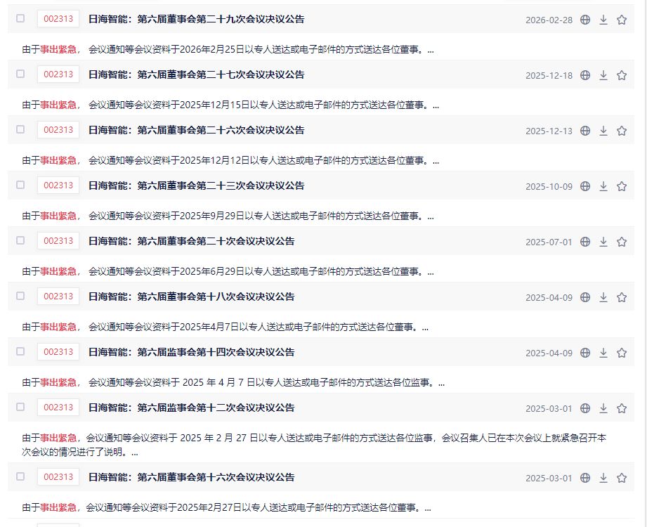 2月27日晚间,日海智能(SZ002313)披露公告称,公司董事会于当日因“事出紧急”召开会议,授权副董事长代行总经理职责。《每日经济新闻》记者梳理发现,自2025年2月以来,该公司已累计9次以“事出紧急”为由突击召开董事会、监事会,审议内容涵盖关联交易、人事变更、资产处置等事项。更有个别会议是召开当天才递送会议材料。