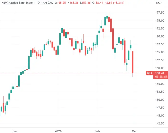 2月28日,美股市场周五开盘后,美国银行、资管和金融服务板块再度遭遇沉重抛售。除了人工智能引发金融系统风险的忧虑外,背靠华尔街支持的英国抵押贷款公司MFS轰然倒闭也引发私募信贷行业的信心动摇。