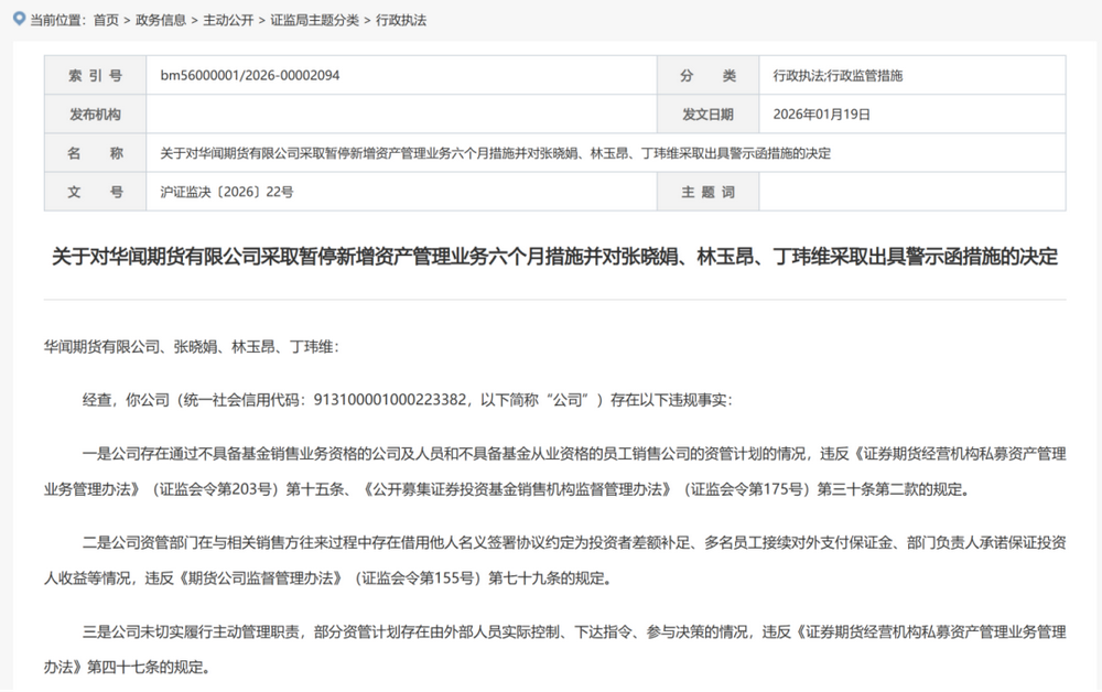 华闻期货则是资产管理业务被采取暂停新增六个月的措施,罚单涉及的违规行为主要涵盖人员资质、产品销售、产品管理、风控等多个方面。