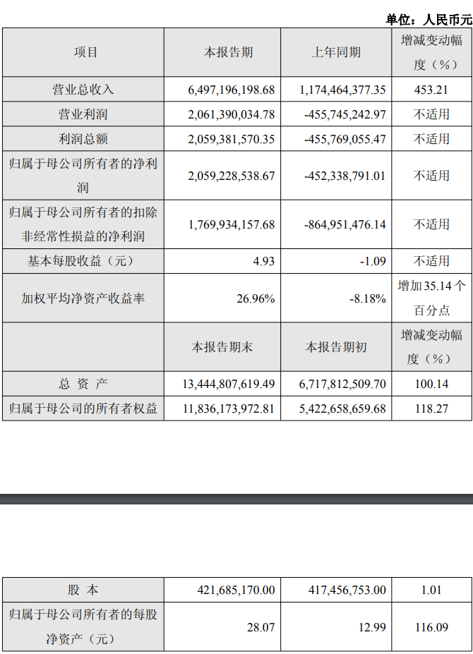 业绩快报显示,2025年度公司实现营业收入64.97亿元,同比增长453.21%,归属于母公司所有者的净利润为20.59亿元,同比扭亏为盈。