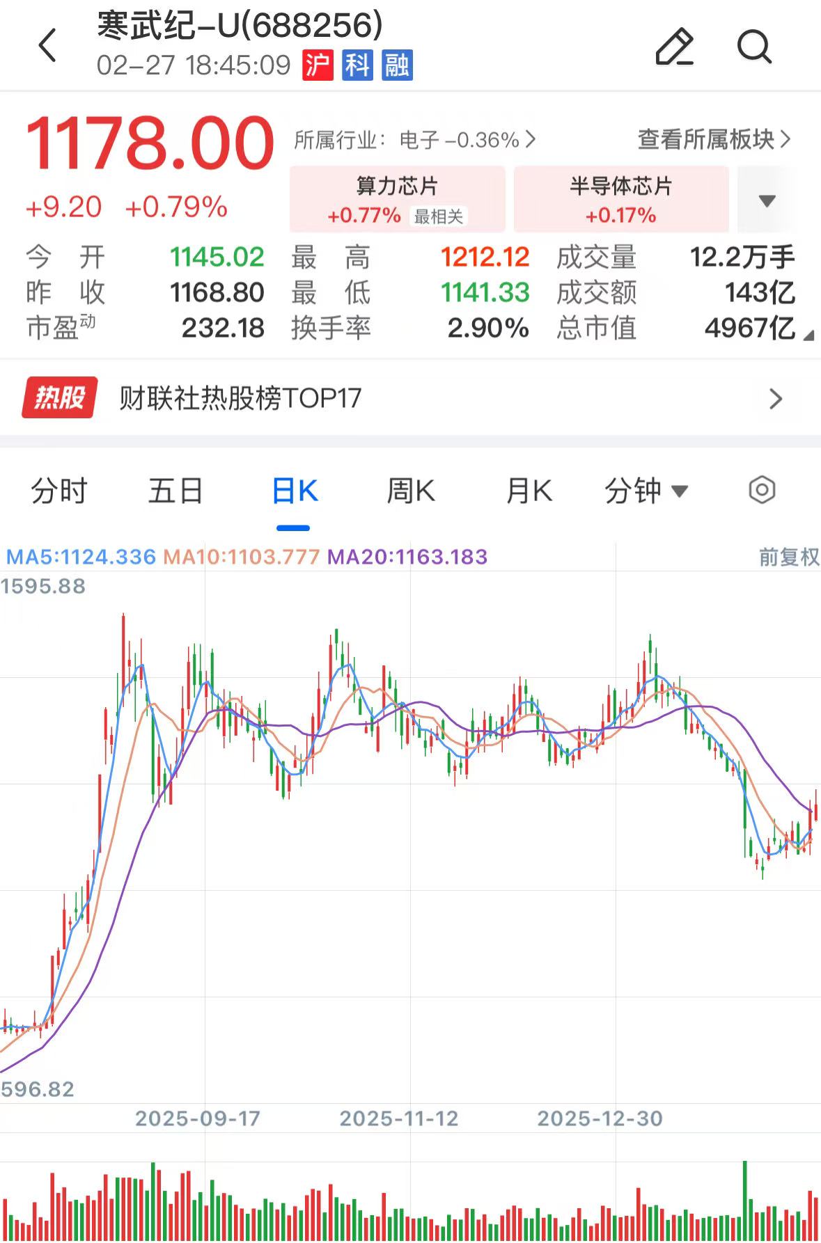 从二级市场表现来看,寒武纪在经历一段时间下跌后,近期股价有所企稳回升,截至今日收盘,该股股价报收1178元/股,总市值达4967亿元。
