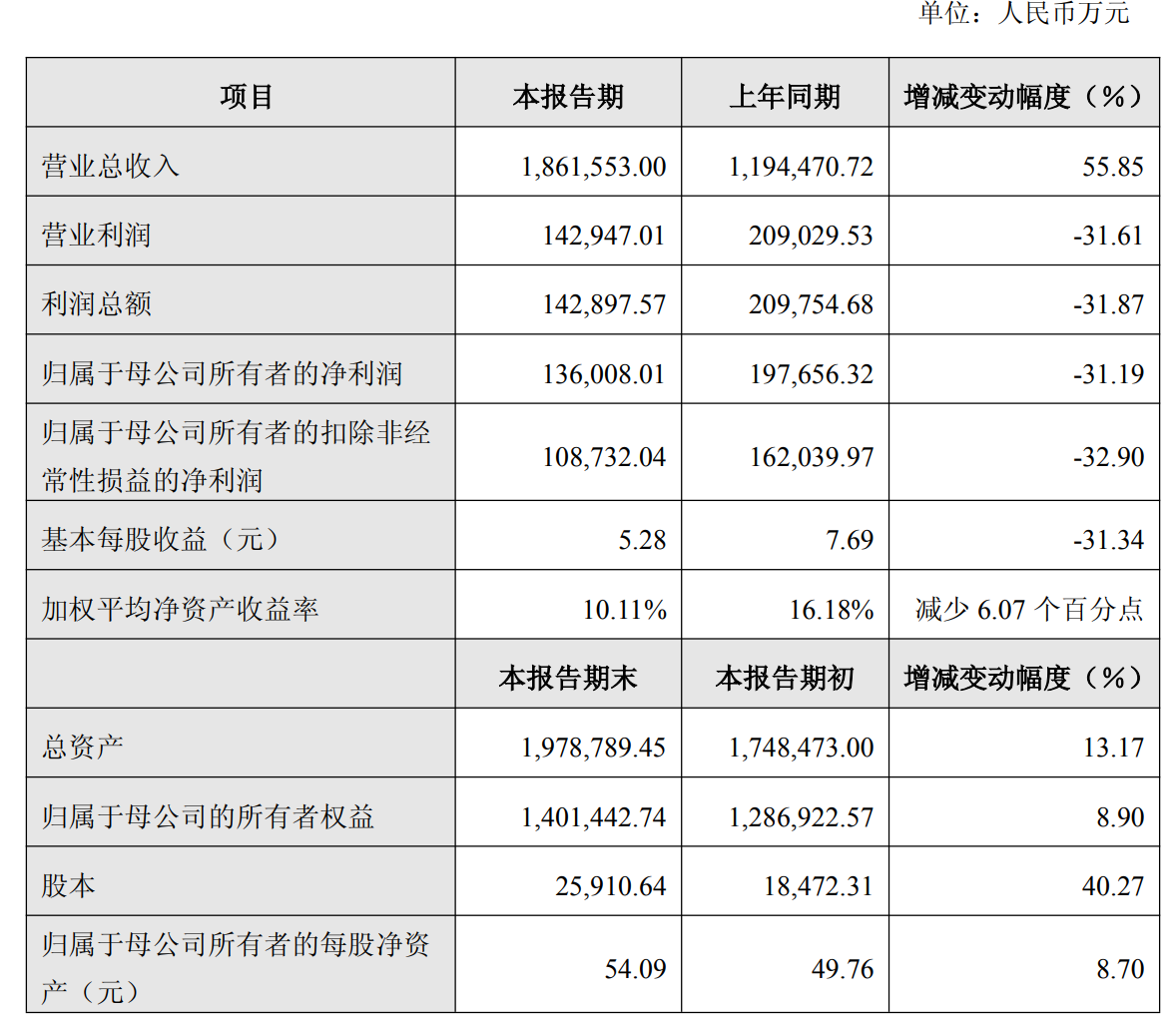 公告显示,公司2025年实现营业总收入186.16亿元,同比增长55.85%;但归属于母公司所有者的净利润为13.60亿元,同比下滑31.19%;扣除非经常性损益后的归母净利润为10.87亿元,同比下滑32.90%;基本每股收益5.28元,同比下降31.34%。