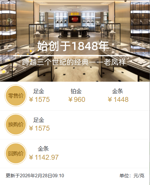 周生生报价1602元/克,周大福报价1608元/克,老凤祥报价1575元/克,老庙黄金报价1608元/克。