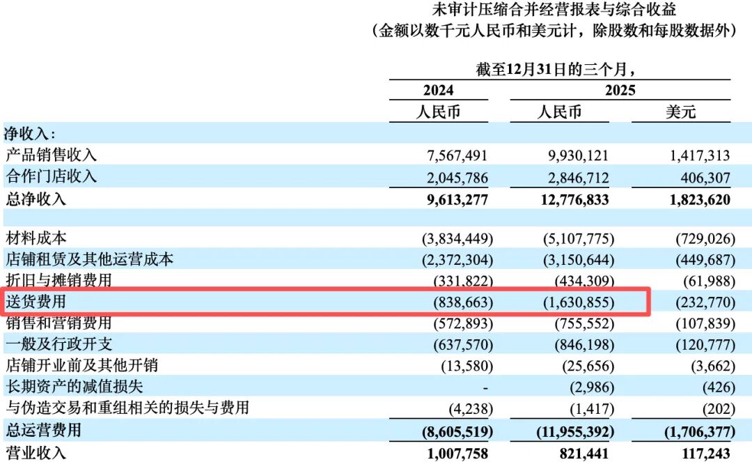 财报显示,瑞幸去年第四季度的配送费用高达16.31亿元,同比激增94.5%、近乎翻倍,正常该费用约占公司总营收的8%,当期比例高达12.8%。