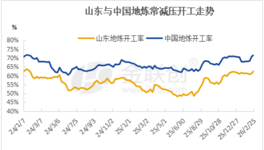据金联创开工率计算公式显示,对山东地炼39家炼厂装置统计,截止到2月25日,山东地炼常减压开工率为62.65%,较上周涨1.37个百分点,创下自2024年2月以来高点。