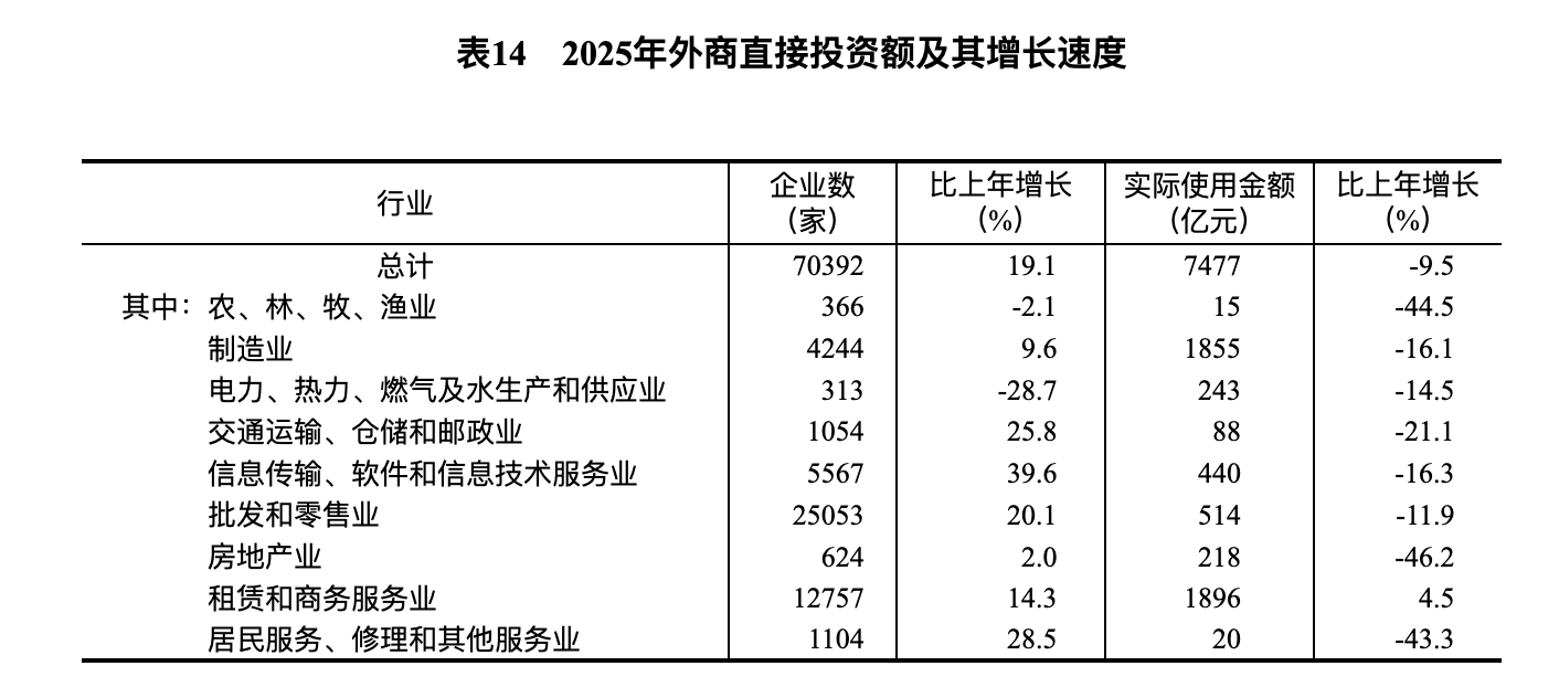 全年新设立外商投资企业70392家,比上年增长19.1%。实际使用外资金额7477亿元,下降9.5%。其中,共建“一带一路”国家(含通过部分自由港对华投资)对华新设立外商投资企业19756家,增长14.7%;对华直接投资1168亿元,增长1.9%。高技术产业实际使用外资2418亿元,下降15.6%。