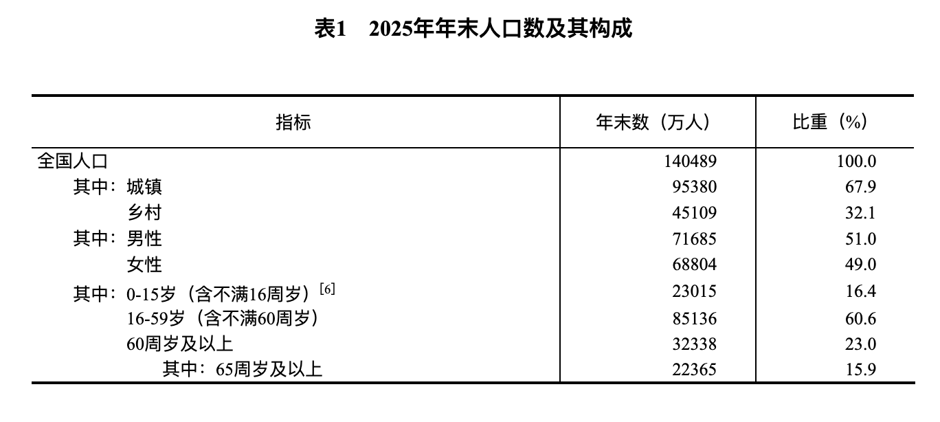 [6]2025年末,0-14岁(含不满15周岁)人口为21276万人,15-59岁(含不满60周岁)人口为86875万人。