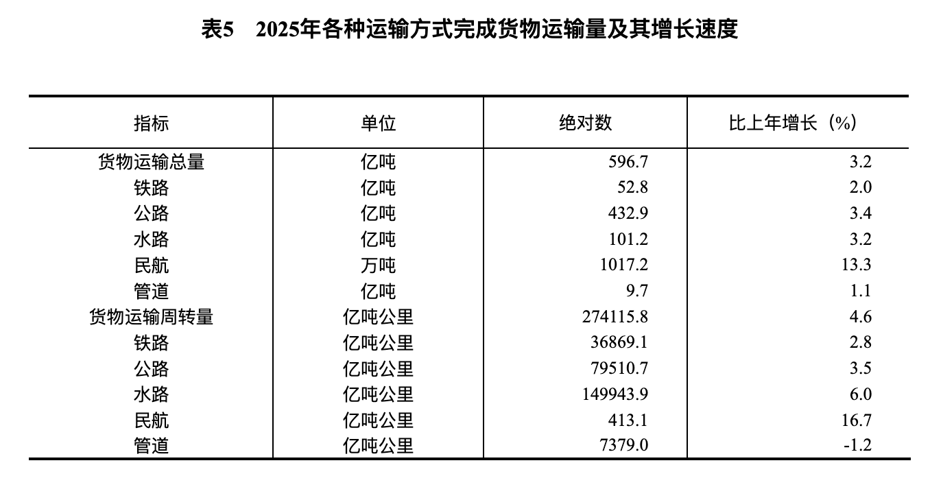 [31]货物运输总量及周转量包括铁路、公路、水路、民航和管道五种运输方式完成量,2025年增速按可比口径计算。