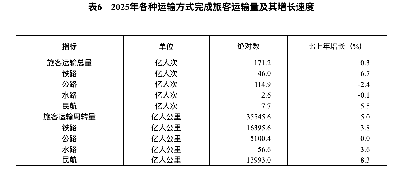 [32]2025年调整网约车载客系数,相应对出租汽车城市客运量等指标本年度及上年同期数据进行调整。2025年旅客运输总量、旅客运输周转量、公路旅客运输量、公路旅客运输周转量增速按可比口径计算。