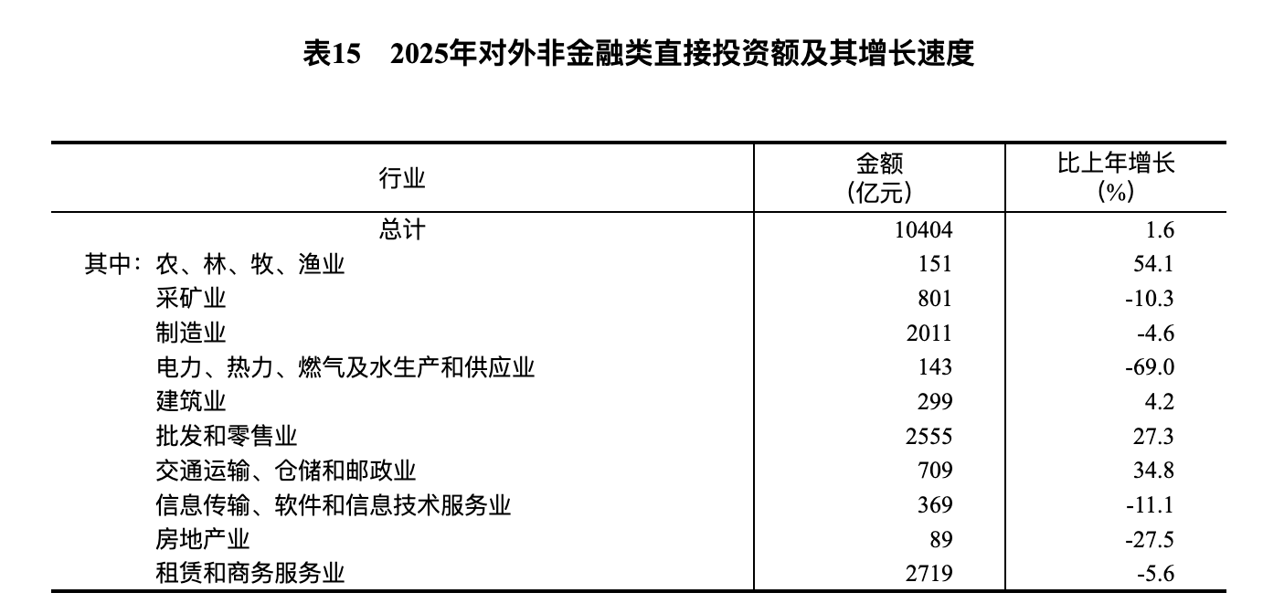 全年对外非金融类直接投资额10404亿元,比上年增长1.6%。其中,对共建“一带一路”国家非金融类直接投资额2834亿元,增长18.0%。