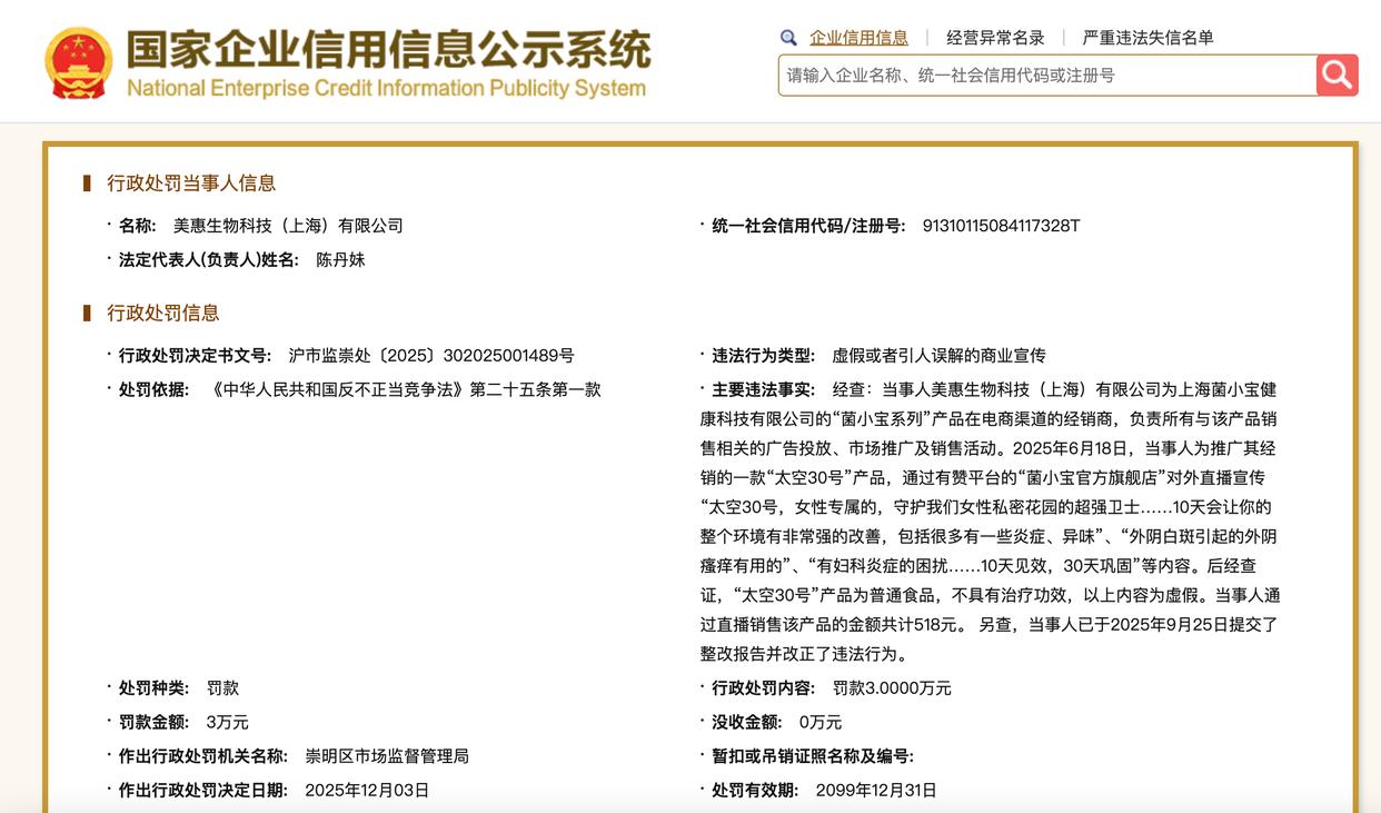 除股权冻结外,近期,菌小宝还被关联上一起虚假宣传处罚事件。据国家企业信用信息公示系统显示,上海菌小宝健康科技有限公司“菌小宝系列”产品的电商渠道经销商美惠生物科技(上海)有限公司,因通过有赞平台的“菌小宝官方旗舰店”对外直播宣传称,其经销的一款“太空30号”产品可“改善妇科炎症”,被上海市崇明区市场监督管理局罚款3万元。